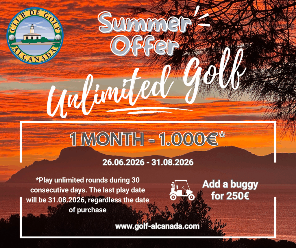 This rate includes the 9-hole green fee and the manual cart. For €15 you can add the buggy or electric trolley to your reservation. This offer cannot be booked online, therefore, for reservations please email us at info@golf-alcanada.com, or please call us at +34 971 54 95 60